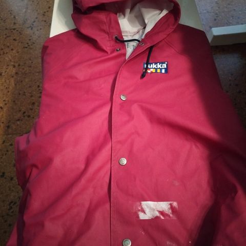 Rukka merkkinen sadetakki koko 122cm. Sisäpuolella takin alaosassa tummentumia.