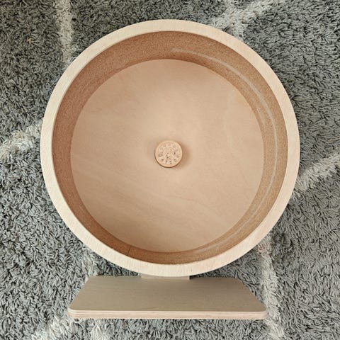 Puinen juoksupyörä, jonka halkaisija on 28cm. Meillä ollut käytössä syyrialaisella hamsterilla.