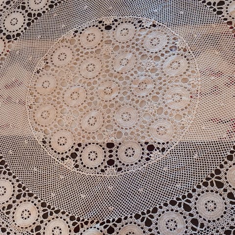 # pyöreä matto, pitsimatto, minna palmu, virkattu kori, virkattuja, virkkaus, käsintehty, maalaisromanttinen, virkatut #