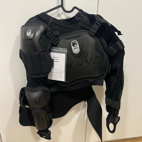 Musta rintapanssari motocross- tai endurokäyttöön. Kovamuovinen suoja edessä ja takana, säädettävät olka- ja sivuhihnat istuvuuden säätöön.