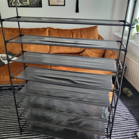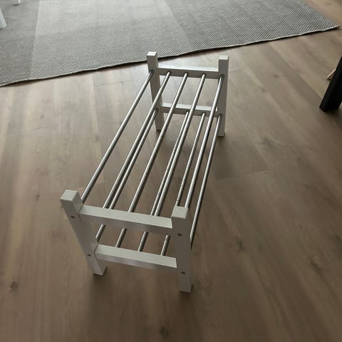 Myydään Veken kalusteesta vuonna -21 ostettu kenkäteline-naulakko. Kengille 3 tasoa. Korkeus 190cm, leveys 68cm ja syvyys 32cm. Haku Lehmosta.