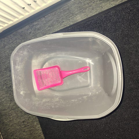 Kissanhiekkalaatikko, jossa on suljettava kansi ja läpinäkyvä läppäovi. Koko L. Uusi. Omat katit eivät tätä hyväksyneet käyttöönsä.