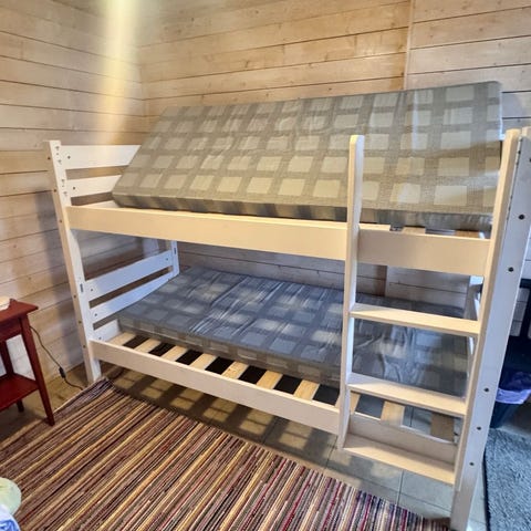 Sänky on hyvässä kunnossa, valmiiksi kasatut osat (yläsänky, alasänky, tikkaat, vuoteenaluslaatikko) ja kevyt ja helppo nostella osissa ja kuljettaa. Kantoapua saa noudetteassa. Maksu mieluiten MobilePay mutta käteinen käy myös.