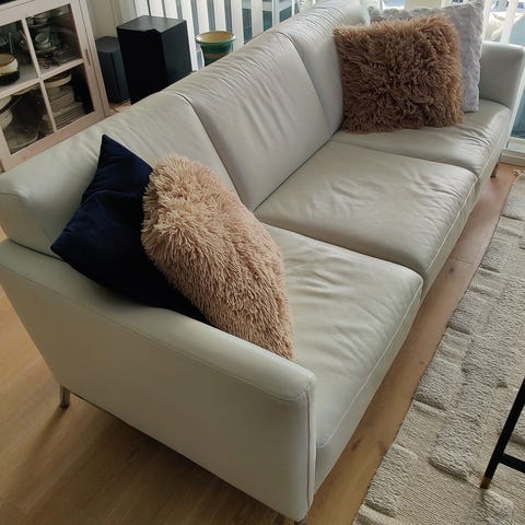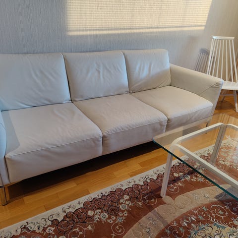 Se on kulunut, mutta hyvässä kunnossa ja hyvin pidetty. Sohvan nurkassa on pieni tahra, jota ei näe ellei etsi. Sekä sohvalla istuminen että nukkuminen tuntuvat mukavilta.