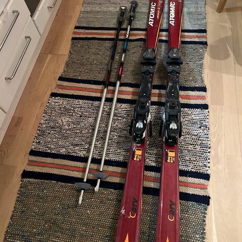 Head laskettelusukset (149 cm) siteillä, väri musta. Mukana K2 laskettelusauvat (105 cm) harmaa–punavalkoisella kuviolla.