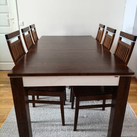 Myydään kuvan ruokailuryhmä. 180cm pitkä ja 90cm leveä. Pöydästä ja tuoleista löytyy käytön jälkiä, niin kuin kuvissa näkyy.
