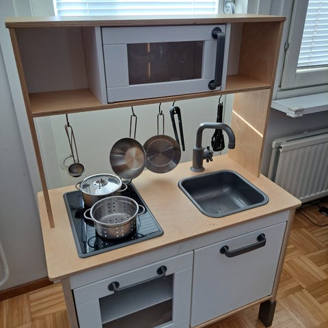 Lasten leikkikeittiö ja keittiöleikkeihin tarvikkeet.