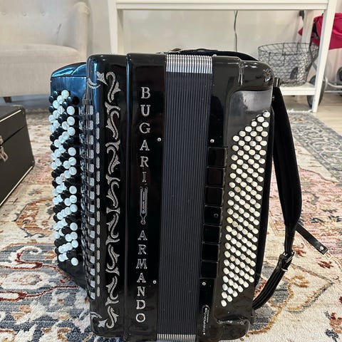 Suosittu ja näppärä Bugarin mini-casotto eurooppalaisella näppäinjärjestelmällä. Hyväkuntoinen ja huollettu, bassopuolen hieman kellastunut levy ainoa kosmeettinen miinus, näkyy kuvassa. Mukana Bugarin oma laukku, haluttaessa mukaan myös reppu +50€. Ei vaihtoa. Kaupat kasvotusten.