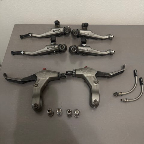 2x jarrukahva droppitankoon/retkipyörään ja 1x Weinmannin metallinen jarrukahva oikealle puolelle, jääneet ylimääräiseksi projekteista.