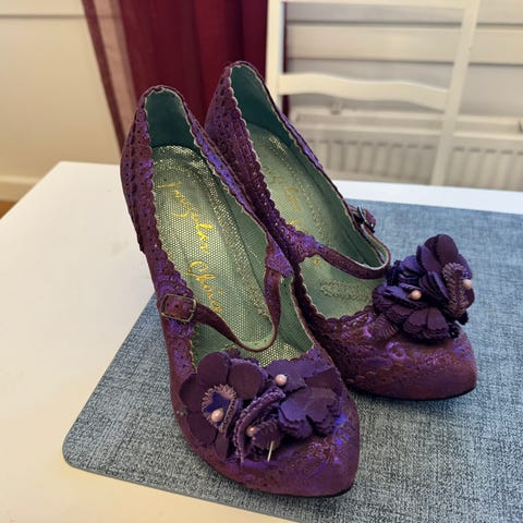 Annetaan kuvan mukaiset Irregular Choicen korkkarit hyvään kotiin. Koko 38, väri hyvin sinisehtävä turkoosi - kulta. Ollut muutamaan kertaan vaimolla juhlakenkinä ja tapahtumissa, mutta ei mene enää jalkaan.