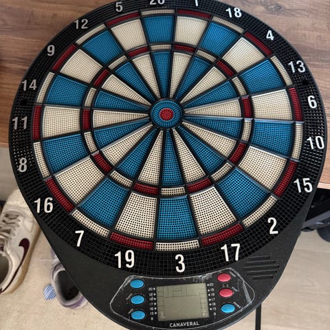 Magneettinen darts-setti hyvässä kunnossa.