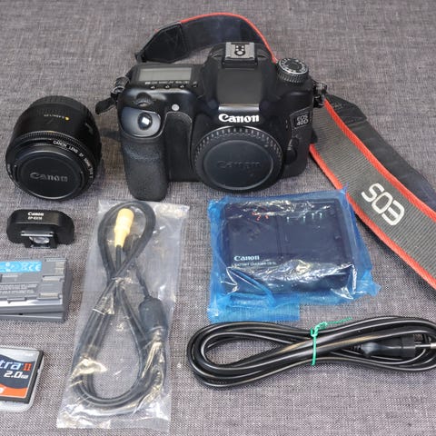 Kuvissa näkyvä Canon EOS 30D -digitaalikamera. Mukaan seuraavat varusteet: