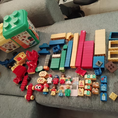 Sekalainen kasa duploja. On hahmoja, eläimiä, ajoneuvoja ja tavallisia Duploja. Sekä osassa duploissa on kuvia (mm. numeroita, kasveja ym.).