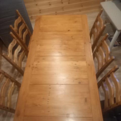 Pöytä aika painava ja tukeva.Käytön jälkiä löytyy,hiomalla saa todella hyvän pöydän.