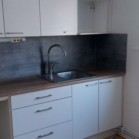 Keittiökaapistot ja työtaso harmailla ovilla. Kokonaisuuteen kuuluu ylä- ja alakaappeja, vetolaatikoita sekä korkeat kaapit. Ovet ovat kehykselliset ja vetimet metallinväriset. Työtaso on vaaleansävyinen, kivikuosia muistuttava laminaattitaso. Kuvissa näkyvät kodinkoneet eivät ole myynnissä, vaan ilmoitus koskee ensisijaisesti kaapistoja ja tasoa, sekä allasta (ei hana)Sopii keittiöremonttiin tai kaapistojen uusimiseen vastaavan kokoiseen tilaan.