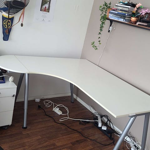 Vähällä käytöllä ollut tukeva työpöytä kaasujalalla. Pöytälevyn saa säädettyä portaattomasti haluamaansa kulmaan. Helppo liikutella kun alla on 2 pyörää. Menee myös kasaan jolloin helppo laittaa vaikka sängyn alle. Syvyys 52cm ja leveys 70-78cm. Korkeimmillaan työtaso lattiasta 118cm.