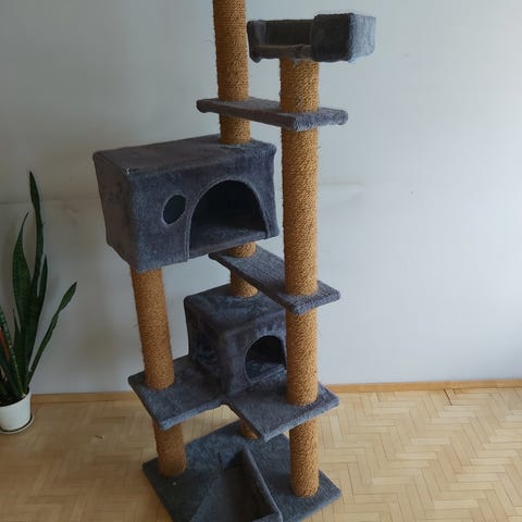 Kissan kiipeilypuu, jossa useita eri tasoja, makuualustoja ja piilopaikka. Harmaa pehmustettu verhoilu ja useat sisal-päällysteiset raapimapylväät. Soveltuu yhdelle tai useammalle kissalle kiipeilyyn, leikkiin ja lepoon sisätiloissa.