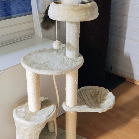 Kissan kiipeilypuu harmaa useilla tasoilla ja raapimapylväillä