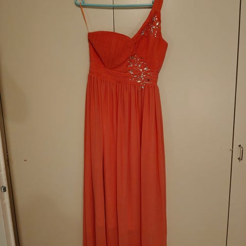 Juhlamekko koko 42. Kainalo- kainalo väli 52 cm. Mekon pituus kaulan kohdalta 105 cm.