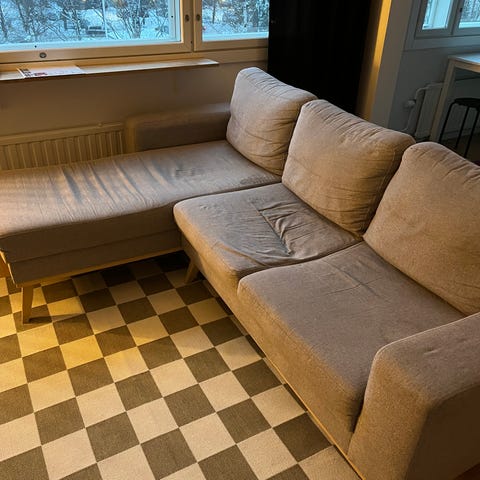 Ehjä sohva annetaan muuton tieltä pois. Sohvassa muutamia mustia likoja jotka mahdollisesti voi saada pesemällä pois (näkyy kuvissa) Sohva alunperin askosta