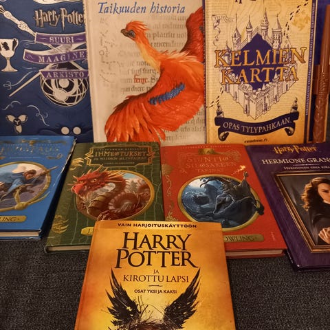 Harry Potter universumiin sijoittuvat kirjat. Muutama naarmu/ryppy, joista kuvat. Myös Ihmeotukset ja niiden olinpaikat -kirjassa ryppy takakannessa.