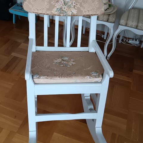 Verhoiltu puutuoli, jossa valkoinen, kaarevalinjainen runko ja koristeelliset yksityiskohdat selkänojassa. Istuinosa on pehmustettu ja verhoiltu beige-sävyisellä raidallisella kankaalla.