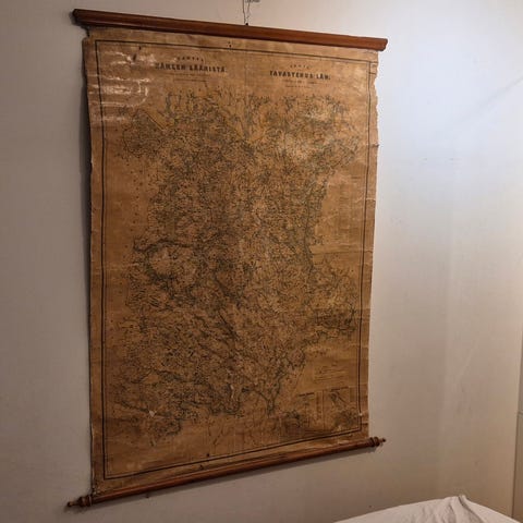 Iso Suomen kartta seinälle, noin kaksi metriä korkea. hyvässä kunnossa on, pieni kolo ylä kulmassa. Materiaalina kangas ja paperi. Vuodelta 1962.