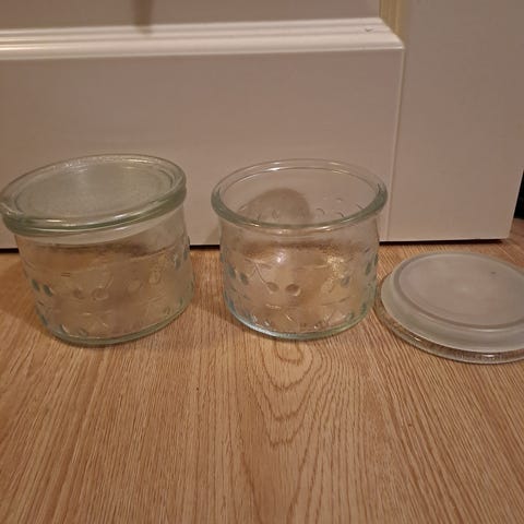 Riihimäen lasin valmistamia lasipurkkeja, joissa on lasikansi ja muovinen tiiviste.