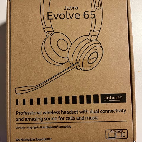 Jabra Evolve2 65 -headset. Käytetty muutaman kerran, kunto erinomainen. Mukana säilytyspussukka, bluetooth-adapteri (käyttämätön) ja lataus-/liitäntäjohto.