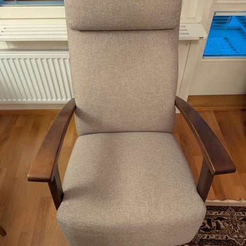 Siisti, harmaa Maskun Ohio -lepotuoli. Tuolin korkeus 103cm, leveys 75cm, istuimen syvyys 55cm. Istuinkorkeus 41cm, istuinleveys n. 54cm. Nouto Tohloppi.