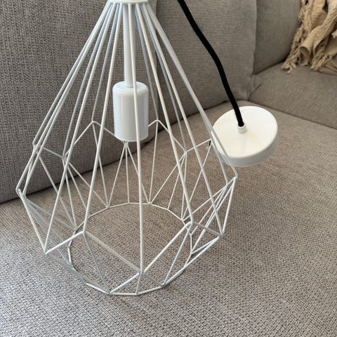 Vanha pieni riippuvalaisin lasikuvulla ja helmihapsuilla. Valaisimessa on valkoinen, porrastettu lasikupu ja sen reunassa oranssilla nauhalla kiinnitetty monivärinen helmihapsukoriste vihreän ja ruskean sävyissä. Yläosassa on metallinen ripustusosa ja valkoinen johto kattokupilla. Sopii sisäkäyttöön yleisvaloksi tai tunnelmavaloksi esimerkiksi olohuoneeseen, makuuhuoneeseen tai eteiseen. Polttimo ei näy kuvissa, joten yhteensopiva lamppukanta ja teho on tarkistettava erikseen.