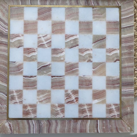 Kivimateriaaleista valmistettu shakkilauta ja nappulat. Yksi valkoinen sotilas puuttuu.