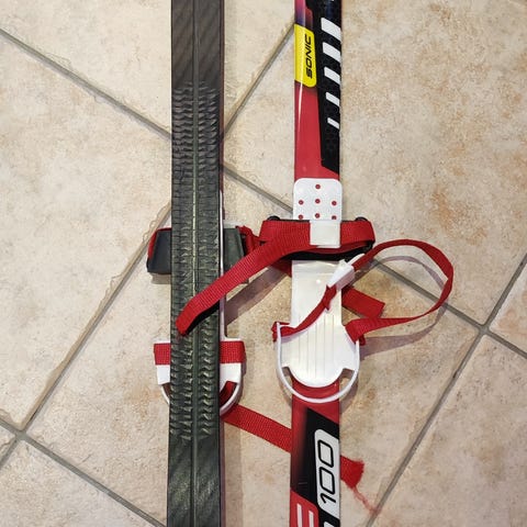 Lasten ensilaskettelusuksipaketti sis. sukset, siteet ja monot. Sukset ovat Elan-merkkiset, pituus 80 cm, monot ovat Dalbello-merkkiset ja koko 15 cm = 25.