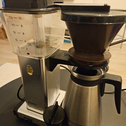 Moccamaster kahvinkeitin, jossa lasikannu ja erillinen vesisäiliö. Laitteessa on suodatinosa irrotettavalla suppilolla ja lämmitinlevy kannun alla. Sopii suodatinkahvin valmistukseen kotikäytössä. Virtajohto etuosassa, mekaaninen käyttökytkin. Runko pääosin metallia ja muovia, kannu lasia muovisella kahvalla ja kannella.