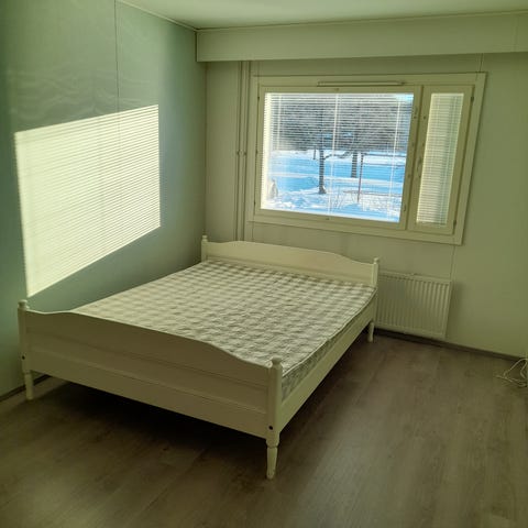 Puinen sänky rottinkipäädyillä. Sängyssä on vaalea puurunko ja sekä päädyissä että jalkopäässä rottinkipaneelit. Ulkomitat 168x 207 cm. Patjan koko 160x200cm. Pohjana on puiset sälepohjat. Joustinpatja ja petari mukaan haluttaessa. Pieniä ulkonäkövirheitä, kuten kuvista näkyy. Purettavissa osiin kuljetuksen ajaksi.