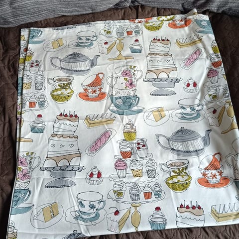 Verho, jossa vihreäsävyinen lehtikuviointi. Hankittu kaksi verhoa Jotexista vuonna 2019, ja toinen myydään käyttämättömänä