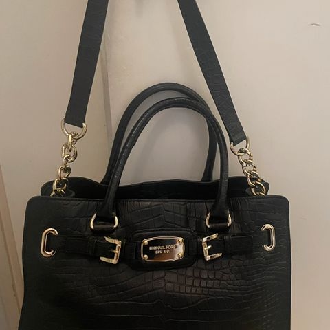 Michael Kors nahkalaukku naisille. Musta nahkainen käsilaukku, jossa kullanväriset metalliyksityiskohdat ja MK-lukko edessä. Laukussa on kaksiosainen kantokahva sekä irrotettava ja säädettävä olkahihna. Sisäpuolella vaalea vuori MK-logokuviolla, vetoketjutasku, avotaskuja ja kiinnityslenkki avaimille. Pohjassa metallinastat suojaamassa laukun alapintaa.