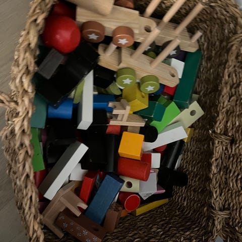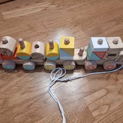 Myyntiin uutena ostetut pinottavat palikat ja koottava perässä vedettävä juna. Palikat ovat kevyet ja helppo käsitellä. Junassa paljon koottavia osia ja eläimiä. Kiva setti seuraavalle leikkijälle!