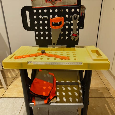 Ihana PolarB:n puinen työkalupöytä seuraavalle leikkijälle. Mukana kuvan mukaiset asiat. Kaikki työkalut tallella ja suurin osa muistakin kuuluvista muttereista yms. Pystyy rakennella mm. autoja. Pieni liitutaulu myös mukana (ei ole meillä koskaan ollut liitutauluna). Käytönjälkiä on erityisesti pöydän pinnassa mutta ei haittaa leikkiä. Ruuvimeisselistä ja jakoavaimesta lähtenyt myös hieman puuta mutta ei haittaa käyttöä.