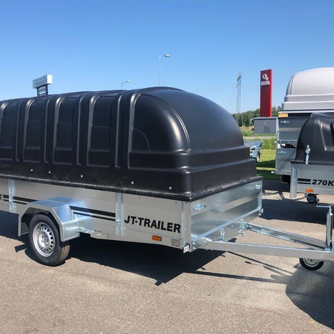 750 kg kuomullinen jarruton peräkärry. Lavan koko 330 x 150. Kippi.