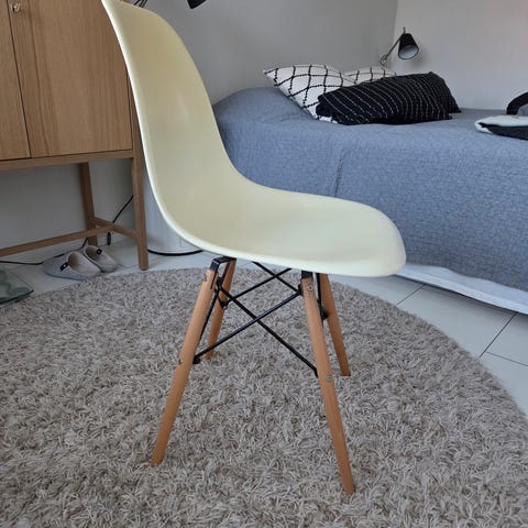 Joitain jälkiä pinnassa, mutta tuoli itsessään ehjä. Itsellä ollut käytössä meikkipöydän tuolina