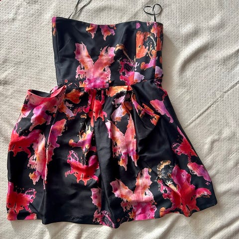 Mekossa on edessä napit, hameosa on laskostettu. Sivusaumassa on piilovetoketju. Mekko on 100% paksua silkkiä. Valmistettu Ranskassa.