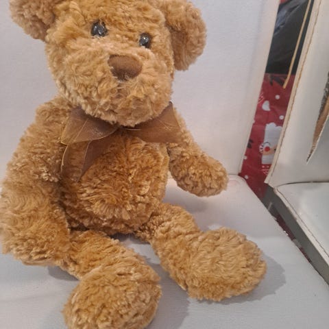Pehmolelu nalle, ruskea väri. Suuret kirjotut silmät ja pehmeä pinta. Sopii leikkeihin tai koristeeksi. Istuva malli.