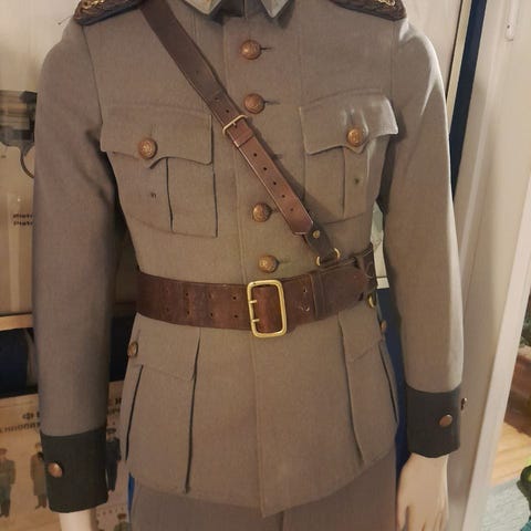 Uudelleen myyntiin. Suomen armeija m/22 takki. Majurin arvolla muistaakseni ja mustat olkapoletit, joissa on päällystön leijona ja RUK-satiaiset. Kyseessä on ihan vanha takki eikä mitään moderni uusiototanto. Ei ole räätälinlappua tai armeijan leimoja, ei sinänsä harvinaista että puuttuvat. Olkaimet ovat vuosien saatessa menneet hieman löysiksi, pysyvät kuitenkin yhä kiinni kunhan ei mene koskettelee niitä. Leijonat osoitttavat väärään suuntaan, melko yleinen vaiva näyttäisi olevan. Hieman kevyttä likaa vuoressa