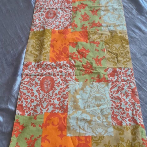 Vihreä-valkoinen kuviollinen pöytäliina.