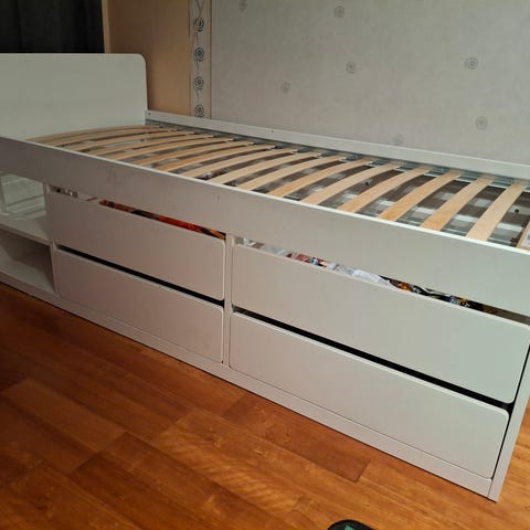 Ikean 4 vuotta vanha Släkt sänky, jossa vedettävä alasänky ja säilytyslaatikot. Hyvin toimiva, mutta alla muutama puute: