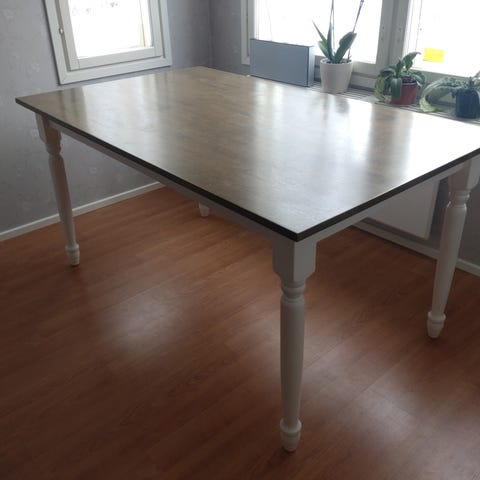 Ikäisekseen siisti 4+2h ruokapöytä. Pois uuden tieltä. Keskeltä saa avattua pidemmäksi (en ole kertaakaan avannut kun toi 4h riittänyt). Omat kantajat mukaan. Ihan keskustassa.