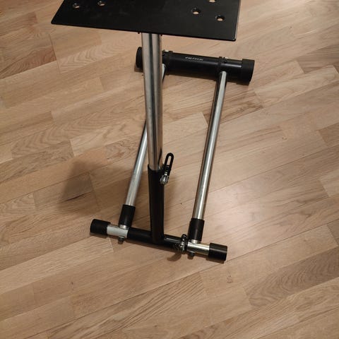 Wheel Stand Pro rattiteline. Metallirunkoinen teline, jossa on säädettävä runko ja musta kiinnityslevy ohjauspyörälle tai muulle yhteensopivalle laitteelle. Rungossa on pikalukitukset joten ohjauslaitteen asentoa voi säätää helposti. Rattitelineen voi laittaa säilytykseen pieneen tilaan.