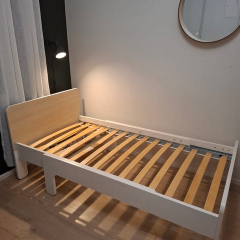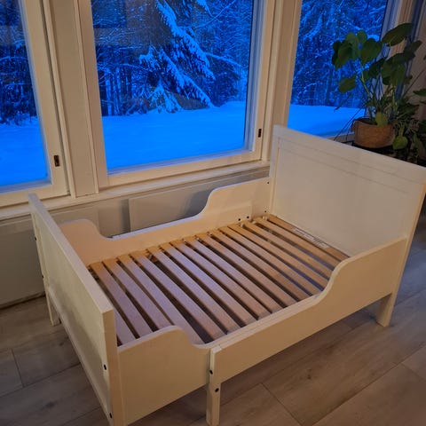 Jatkettava Ikea Minnen sänky. Kunto hyvä. Muutama pohjasäle puuttuu, jos sänky on laitettu täyteen pituuteen. Kuvassa oleva aluslaatikko ei kuulu mukaan.