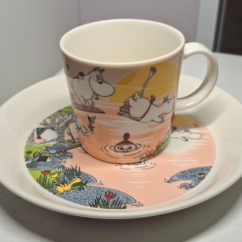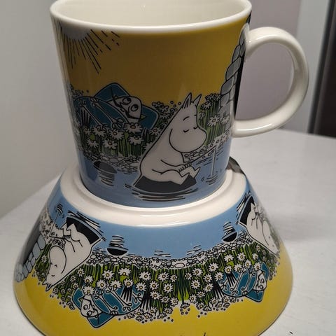 Hentolumisade muumimuki+kulho. Uusi setti tarroilla. Kulkeutuu satunnaisesti Kuopioon.